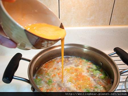 步驟七:(請先入少許鹽調味進入步驟七...開中火緩慢到入蛋液,可愛的蛋花跑出來囉!口水直直流...)