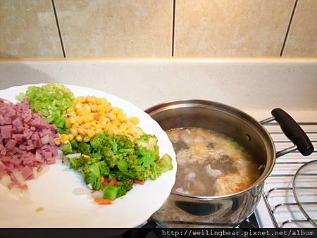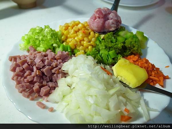 準備時材有:(芹菜.紅蘿蔔.洋蔥.玉米.火腿.花椰菜.碎肉.動物性奶油)