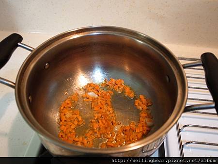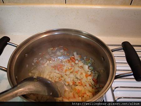 步驟三:(加入洋蔥丁翻炒20秒,維尼熊是用台灣出產的洋蔥很快軟化,台灣的洋蔥讚啦!非常的甜...XD)